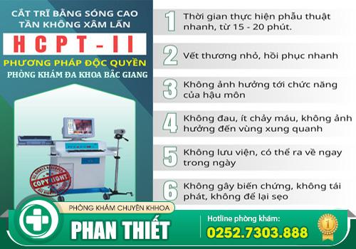► Phương pháp sóng cao tần HCPT: chủ yếu sử dụng sóng điện cao tần từ 70-80 độ C để làm đông các mạch máu, sau đó dùng dao điện để cắt bỏ các búi trĩ ngoại nằm ngoài hậu môn. Đây là phương pháp xâm lấn tối thiểu không gây bỏng, ít chảy máu và có thời gian phục hồi nhanh chóng.